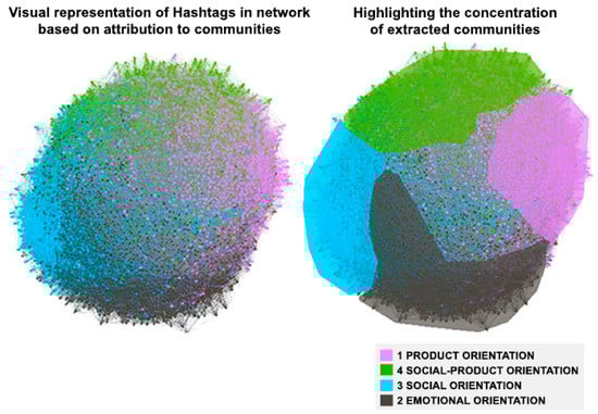 In the field of visualization, it is possible to use the following algorithms, which are part of programs for visualization and analysis of data in networks: ForceAtlas, an algorithm used for networks based on the so-called small-world network. This is a type of mathematical graph in which most nodes are not neighbours, but neighbours of any given node are likely to be neighbours of each other, and most nodes can be reached from every other node by a small number of connections [57]; ForceAtlas2, an improved version of the ForceAtlas algorithm, which focuses on large networks. It is a method based on reduced samples’ visual representation to define network communities and their types [58]. The advantage over ForceAtlas is its speed and ease of computing. The ideal number of hashtags is 10,000–100,000 [59]. To visualize a network with a number of hashtags from 1000 to 10,000, it is best to use the ForceAtlas 2 algorithm due to the calculation speed. The result of the ForceAtlas 2 algorithm is, for example, a subsequent layout (see Figure 5), where it is possible to identify five main communities and their mutual position (polarity).