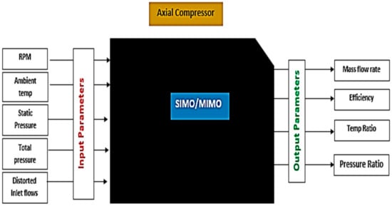 A turbofan engine is designed to cope up with different climatic conditions, from desert to coastal, tropical, arctic, agricultural, and oil fields. Weather conditions, surrounding temperature, and airborne contaminations have a great influence on the performance of the turbofan engine. The unfavorable effects of non-uniform temperature inlet flow on gas turbine engine operations have always been a hindrance to the performance of turbo-fan engines. Propulsive efficiency is a function of the overall efficiency of the turbofan engine, which itself is dependent on other ambient parameters. The primary concern of distorted inlet temperature is the ingestion of hot gasses from the environment. At high ambient temperatures, air density decreases, reducing the air-fuel mixture for combustion and resulting in a decrease of lift, thrust, and aerodynamic drag. The performance and stability of a transonic axial compressor with non-uniform inlet flow is a significant concern in recent times for its design and operability of a low bypass turbofan engine. In both military and commercial aircrafts, serpentine ducts produce significant inlet swirl distortion. High circumferential swirl flow and inlet flow angularity decrease aerodynamic performance, stall margin, and increase rotor blade loading []. Learning algorithms can be helpful in various applications, for example, prediction analysis, clustering, identification of uncertainty, and instability of the data. The objective of deep learning, for the most part, is to comprehend the structure of data and fit that data into models that can be comprehended and used by researchers. The algorithm trains the input data source and utilizes the statistical analysis approach to yield the output values that fall inside a specific range. Based on input data, it develops structure models from sample data to automate the decision-making processes. ML classes depend on how learning is received or how feedback on the learning is given to the framework developed. Sohail et al. [] investigated a predictive approach based on an Artificial Neural Network (ANN) to predict the transonic compressor performance and behavior at icy, moderate, and extreme hot diversified ambient temperature conditions due to seasonal effects under design RPM. Their model produces substantially accurate results of a compressor rotor at different ambient temperatures when compared with the results of CFD analysis. The results visualized through unity plots are a clear indication that, given any set of temperature and pressure values, the trained model can accurately generate predictions of mass flow rate, temperature ratio, pressure ratio, and efficiency in less computational time, as compared with simulating the models through CFD analysis. However, variable RPM, pressure distortion, bulk flows, and their combined effects on the compressor were not investigated. Furthermore, a shallow Artificial Neural Network model had been developed and trained concerning the same set of features.