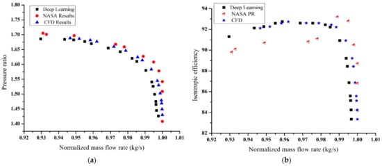 (a) Pressure ratio vs. normalized mass flow rate, and (b) isentropic efficiency vs. normalized mass flow rate.
