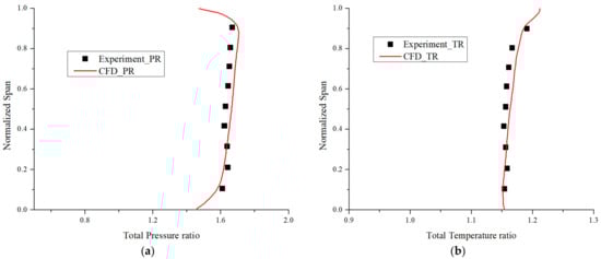 Figure 4a,b compares the total pressure and temperature ratio loading distribution at peak efficiency. It is observed that the computational total pressure loading is slightly decreased near the leading-edge region. The downstream spanwise variations of total pressure and total temperature ratios depict nice validation with available experimental data.