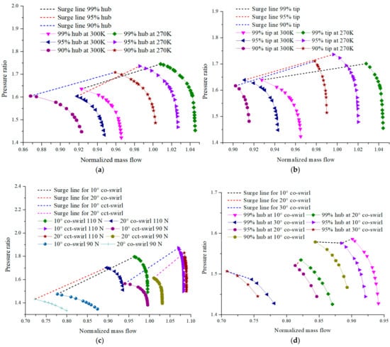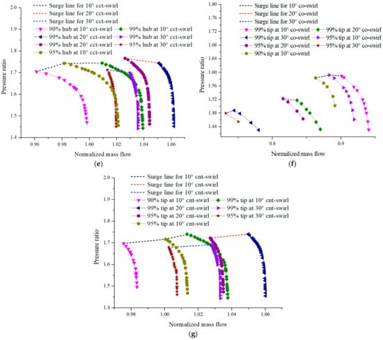 Furthermore, 10° co-swirl at 90% of design RPM has a better overall stability range than other flow distortion. Hub radial and co-swirl flows have a better comprehensive stability range than tip radial and counter swirl flows. When these distortions are combined, it had a qualitative effect on compressor performance. Figure 5d–g show hub and tip radial pressure distortion combined with bulk flows. The characteristic map shows that at 90%, hub radial combined with 10° co-swirl has a better overall stability range.