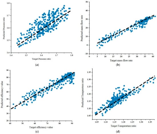 Earlier a time-marching throughflow method for the off-design performance analysis of axial compressors was analyzed on rotor-67. The method was based on the Euler equations, and an inviscid blade force model was proposed to achieve desired flow deflection. The flow discontinuity problems at the leading and trailing edges were tackled by automatic correction of blade mean surface using cubic spline interpolation. The flow discontinuity issues at the leading and trailing edges were addressed by using cubic splitting to automatically fix the blade mean surface [,]. In this research, multilayers, Feedforward, and a supervised learning Neural Network with the ReLU activation function are selected for training, testing, and validating the data set. The unity plot elaborates on the network’s performance when the trained model is passed through the test dataset. The plot shows the trained model’s generalizability such that the predicted samples should lie closer to the unity line. Figure 7a–d shows the test data unity plots of mass flow rate, pressure ratio, temperature ratio, and isentropic efficiency. The x-axis corresponds to the test dataset’s target values, while the y-axis shows the predicted values obtained when the trained model is tested with the test data set.