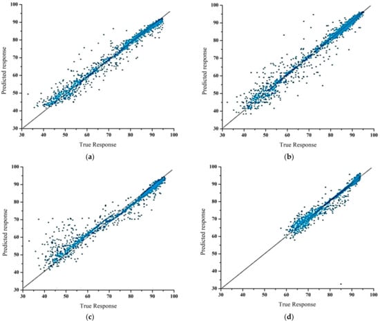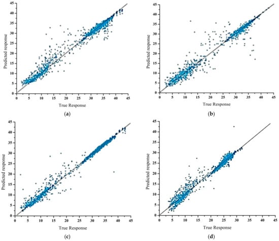 The predicted versus actual regression learner plots are utilized to check model execution after preparing a model. An ideal regression model has an expected response equivalent to the true response, so all the values lie on a regression line. Variations from regression on the line are termed as prediction errors for that point. A reasonable model has minimum errors; thus, the forecasts dissipate close to the regression line. Typically, almost perfect modeled results are evenly spread around the regression line. The complete algorithm of linear regression, stepwise regression, tree (fine, medium, and coarse), SVM (quadratic, cubic, fine, medium, and coarse), ensembled (boosted tree, and bagged tree), and gaussian process regression (GPR) models (squared exponential GPR, Matern 5/2 GPR, exponential GPR, and rational quadratic GPR) are analyzed, whereas the response plot of these models is selected based on predicted versus actual results, which dissipate close to the regression line [,]. A comprehensive examination of these models was evaluated in terms of root mean square error and R-squared error.