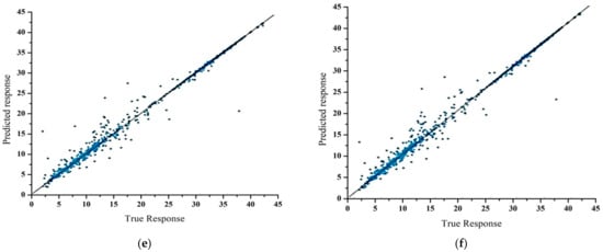 Regression models for temperature ratio (a) Ensembled Bagged Tree, (b) Tree Fine, (c) SVM Medium, (d) Stepwise Linear, (e) GPR Exponential, and (f) GPR Rational Quadratic.