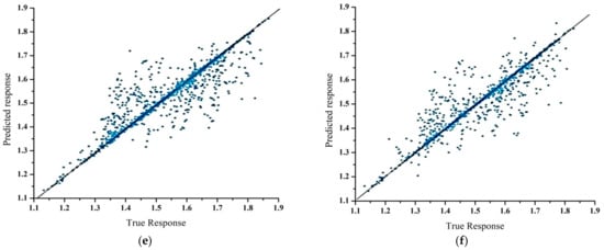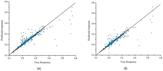 Regression models for pressure ratio (a) Ensembled Bagged Tree, (b) Tree Fine, (c) SVM Medium, (d) Stepwise Linear, (e) GPR Matern, and (f) GPR Rational Quadratic.