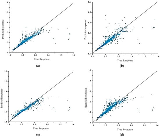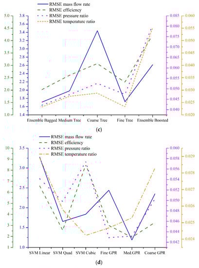 As discussed earlier, based on predicted versus actual results, which are dissipated close to the regression line, the response plot of these models is selected. Figure 13 shows that GPR Exponential has better RMSE results for isentropic efficiency and mass flow rate for the selection of the model. Similarly, for selecting pressure ratio and temperature ratio, GPR Matern has a better overall RMSE value, whereas GPR Exponential and GPR Quadratic lie close to the GPR Matern.