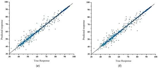 Regression models for isentropic efficiency (a) Ensembled Bagged Tree, (b) Tree Fine, (c) SVM fine, (d) Stepwise Linear, (e) GPR Matern, and (f) GPR Rational Quadratic.