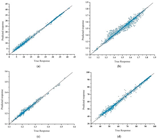 Best Response Regression Models (a) Exponential GPR for mass flow rate, (b) GPR Matern for pressure ratio, (c) GPR Matern for temperature ratio, and (d) GPR Exponential for isentropic efficiency.