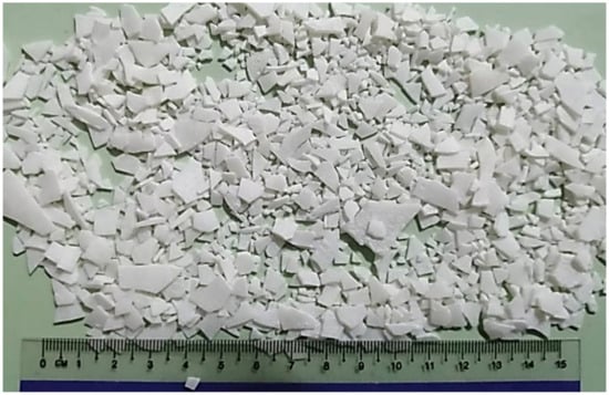 The grade of the bitumen utilized to produce the asphalt mixes was 80/100, which is suitable for the wearing course. The characteristics of the base and modified bitumen are listed in Table 1. Also, an organic additive called LEADCAP was utilized to produce warm mix asphalt. LEADCAP is a wax-based component that consists of a crystal controller and an adhesion promoter to control the crystallization of the wax components at low temperatures and to improve the bonding between the aggregates and the binder []. LEADCAP is produced by KUMHO petrochemical (Seoul, South Korea). Figure 1 shows the LEADCAP additive. Electric arc furnace (EAF) steel slag was used as the coarse aggregate, while granite aggregates were utilized as the fine aggregates in the preparation of the asphalt mixes. The EAF steel slag was supplied by NCL chemicals Ltd. chemical products, Singapore. Table 2 displays the characteristics of the electric arc furnace steel slag and granite aggregates. The gradations of the aggregates are listed in Table 3.