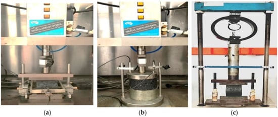 The test of moisture sensitivity was carried out to investigate the resistance to moisture damage of the asphalt mixes. The moisture sensitivity test was conducted according to the procedures stated in AASHTO T 283 []. To perform this test, 30 samples were produced. The air void content of the produced specimens was targeted at 7 ± 0.5%. Six specimens were manufactured for every mix. Three represented the dry condition, while the rest corresponded to the wet condition. In the dry condition, the specimens were kept in the environmental chamber for at least two hours at a temperature of 25 °C. Then, the specimens were subjected to an indirect tensile strength. For the wet condition, the samples were exposed to a water saturation of 70–80%. Thereafter, the specimens were conditioned in a water bath for 24 h at a temperature of 60 °C. Then, the specimens were immersed in the water bath for at least 2 h at a temperature of 25 °C. Thereafter, every sample was subjected to the applied indirect tensile strength at a constant rate of 50 mm/minute. The tensile strength of the asphalt mix should be higher than 80%. Figure 2 shows the tests setup of the stiffness modulus, dynamic creep, and moisture sensitivity.