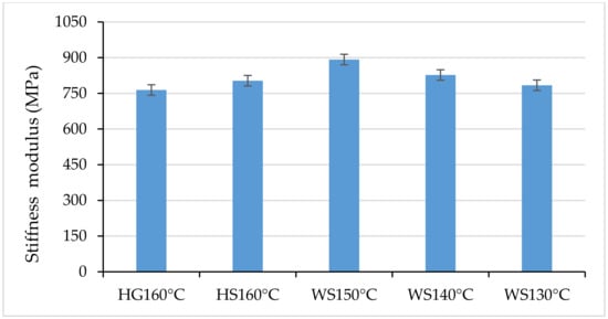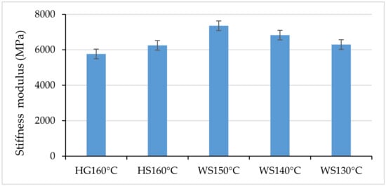 The stiffness modulus of the asphalt mixes at 25 °C and 40 °C are shown in Figure 3 and Figure 4. As it is seen in the figures, the asphalt mixes composed of steel slag aggregate as the coarse portion exhibited better stiffness modulus results than the reference asphalt mix incorporating conventional aggregates. The higher stiffness modulus of HS160°C was caused by the superior toughness and angularity of the EAF steel slag aggregates. Furthermore, warm mix asphalt produced at 150 °C exhibited the highest stiffness modulus at 25 °C and 40 °C as compared to the other mixtures. The stiffness modulus of WS150°C at 25 °C was higher than that of the HS160°C by 18.6%, while at the 40 °C WS150°C showed a higher stiffness modulus than that of the HS160°C by about 11%. Also, the stiffness modulus of WS140°C at 25 °C and 40 °C were higher than that of the HS160°C by about 10% and 3%, respectively. The warm asphalt mix produced at the mixing temperature of 130 °C, which was lower than the control mix by 30 °C, showed similar stiffness modulus results to the HS160°C at the temperatures of 25 °C and 40 °C. Moreover, WMA produced at 150, 140, and 130 °C revealed better stiffness modulus than HG160°C. The higher stiffness modulus of the warm mix asphalt produced at the temperatures of 150 °C and 140 °C was attributed to the hardening and crystallization of the wax competent in the modified binder during the conditioning of the specimens to simulate short-term aging. As the production temperature of the warm mix asphalt increased, the bitumen hardening increased, and this, in turn, improved the stiffness of the asphalt mixes.