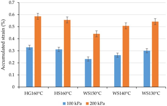Figure 5 presents the results of the permanent deformation test at the applied stresses of 100 kPa and 200 kPa. It is clearly seen in Figure 5 that the higher accumulated strain indicates the lower resistance to permanent deformation of the asphalt mixes. As shown in Figure 5, HG160°C exhibited a slight decrease in permanent deformation resistance in comparison to HS160°C. On the other hand, the produced asphalt mix at the mixing temperature of 150 °C incorporated 2% of LEADCAP exhibited the lowest accumulated strain in comparison to the other mixes. The accumulated strain was lower than the HS160°C by about 25% and 20% for the applied stresses of 100 kPa and 200 kPa, respectively. Additionally, WS140°C exhibited better permanent deformation resistance than the HS160°C by about 15% and 9% for compressive stresses of 100 kPa and 200 kPa, respectively. The permanent deformation of the mixtures produced at the mixing temperature of 130 °C (WS130°C) was approximately comparable to that of the HS160°C mix. Furthermore, the warm mix asphalt produced at 150, 140, and 130 °C displayed lower accumulated strain than the reference mix incorporating natural aggregates (HG160°C). The better resistance to permanent deformation of the mixes incorporating the LEADCAP additive was caused by the crystallization of the wax component in the additive, which stiffened the binder [].