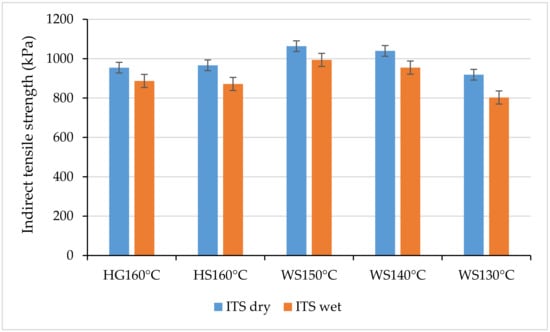 Indirect tensile strength and the standard error bars of the asphalt mixes.
