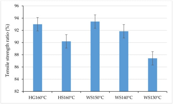 Moisture susceptibility is the most serious concern associated with producing warm mix asphalt. The damage of moisture sensitivity in WMA is attributed to the incomplete drying of the aggregates and the coating of the aggregate with bitumen due to the lowering of the production temperature. Modifying the binder with WMA additive may decrease the efficacy of the bonding between the binder and the surface of the aggregates. In this study, the efficiency of using LEADCAP in producing WMA was investigated through a test of moisture susceptibility. The conditioned and unconditioned indirect tensile strengths, as well as the ratio of the tensile strength of the asphalt mixes, are demonstrated in Figure 6 and Figure 7. It is shown in Figure 7 that HG160°C demonstrated slightly higher resistance to moisture damage, compared to HS160°C. This was caused by the high porosity of the EAF steel slag aggregates. Additionally, it is seen in the figures that WS150°C displayed a higher tensile strength ratio (TSR) and indirect tensile strength (ITS) than the reference asphalt mixes. Production of the warm mix asphalt at 140 °C exhibited higher ITS and TSR than that of the HS160°C. This is because the LEADCAP additive contained an adhesion promoter. Decreasing the production temperature by 30 °C slightly decreased the indirect tensile strength and tensile strength ratios in comparison to the control mixes produced at 160 °C. As the manufacturing temperature of the warm mix asphalt increased, the tensile strength and ratio of tensile strength improved.