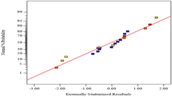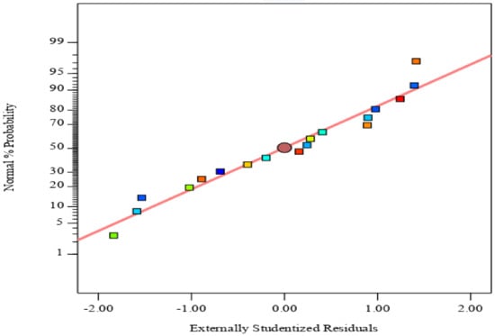 The assumptions of the linear model should be investigated to examine its adequacy. Figure 11 illustrates the assumptions of the normality of the linear regression. The plot of normal probability displays the shape of the error distribution. The straight distribution of the errors indicates that linear regression fits the data well, whereas the other shapes such as right skew, left skew, S, or long and short tails, imply that the error distribution is not normal, and thus that linear regression is not suitable. As seen in Figure 11, the residuals are distributed normally, since the points are close to the line of the theoretical residual. In addition, the Anderson–Darling test was carried out to check the assumption of normality. The p-value of the Anderson–Darling test was insignificant (p-value = 0.3505 > 0.05), which indicates that the errors were normally distributed.