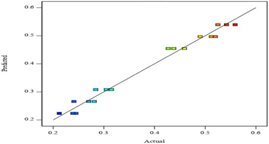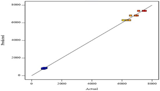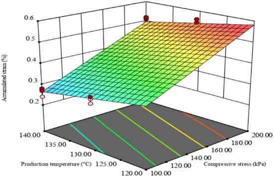 Table 9 shows the ANOVA for the linear model. As seen in Table 9, the significant p-value of the factors implies that the applied compressive stress and production temperatures had a considerable effect on the accumulated strain of the warm mix asphalt. The linear model is expressed in Equation (2).