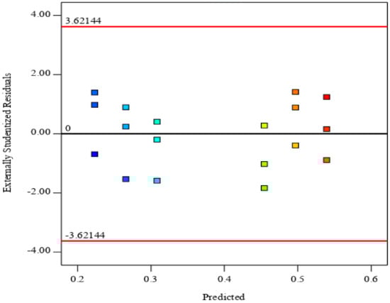 A plot of the externally studentized residuals versus the predicted values was used to assess the assumption of homoscedasticity (equal variance). In other words, linear regression assumes that the variance in the residual versus predicted value plot is constant, with a symmetric shape. Therefore, a symmetrically shaped distribution of errors around the zero in the scatter plot indicates homoscedasticity, while asymmetric shapes in the scatter plot are heteroscedastic. The asymmetric shapes in the scatter plot indicate that the linear model is not suitable. Figure 12 shows that the predicted values versus residual values are distributed around zero in a symmetric shape. Thus, the linear model was suitable to predict the accumulated strain of the warm mix asphalt.