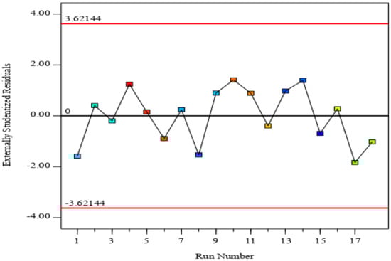 To check the assumption of independence in the linear regression, a plot of the externally studentized residuals versus the run number is worthwhile. The residuals versus run number plot is used to detect autocorrelation between disturbances. Autocorrelation occurs when the residuals have a pattern where they remain positive or negative. As shown in Figure 13, there was no autocorrelation among the disturbances, since the residuals randomly transitioned between positive and negative values, which indicates that the dependent variable of accumulated strain was not independent.