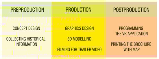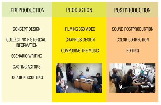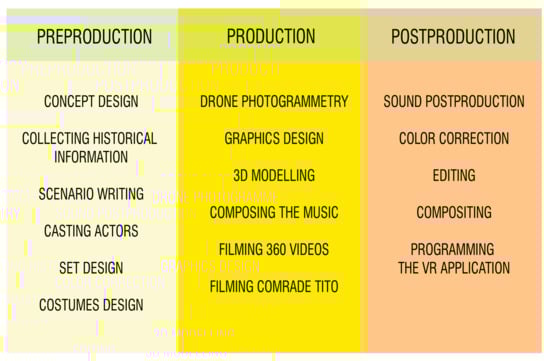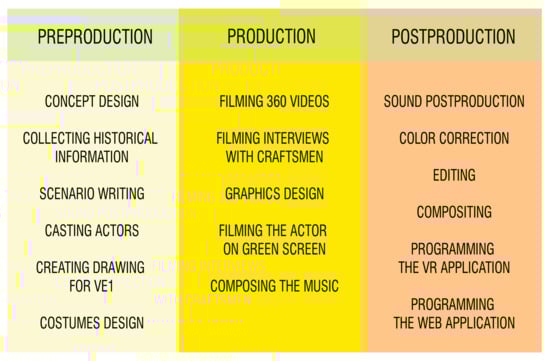 In every digital cultural heritage application, we start with the preproduction phase. This phase is very important as it includes the planning of all the elements needed for production and postproduction. Whatever is not considered in this phase might later cause a loss of time and budget. At the beginning, the producer and director agree on the concept of the application. In this case it is a VR video presenting the selected topic. According to the available budget they plan the resources, such as the number of actors, number of filming days and filming locations. The expert historians provide information on the topic for the scenario writer. The writer creates the scenario based on the prepared concept.