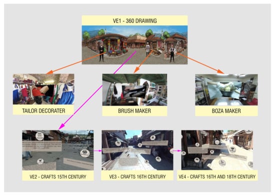 The application consists of four virtual environments (Figure 3). The first virtual environment is a drawing of Baščaršija created as a 360 image. The actor recorded against the green screen is wearing the traditional costumes of the craftsmen and telling a story about each craft. Clicking on the entrance behind the actor, the user enters into the VR video of the craftsman’s workshop, where a story told by the last craftsman of that craft is superimposed. The real craftsman presents the process of his craft making.