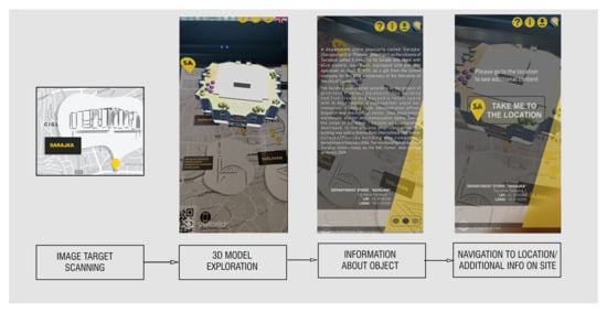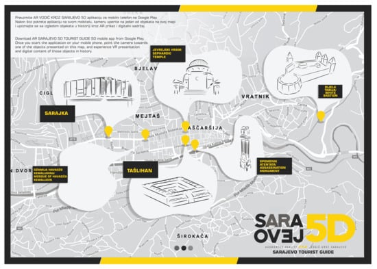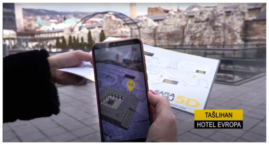 One of the first works in this field proposed a personalized electronic guide and tour assistant for cultural site visitors [] which provides augmented reality reconstructions of ancient ruins. A similar approach is used in our project Sarajevo 5D, where we created 3D models of historical objects that do not exist anymore, or at least not in the same condition as before. Besides this, our work aims to make use of Augmented Reality content to attract users to come to the site, without limiting them to using the application on site only. A similar approach has already been used and examined [,,] and there are multiple confirmations of the value of Augmented Reality applications in heritage presentation [,,].