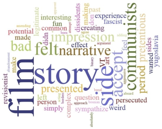 In order to document emotional experience of the participants; we have included the open questions asking for the feelings after viewing the film and their feedback. The answers were analysed to identify key themes linked to the user experience. The most frequent themes have been identified as: Story, Side, Accept, Communists, Felt, Impression, and Narrative. The list of the themes identified from the open questions are shown in the word cloud diagram depicting their frequency, see Figure 12.