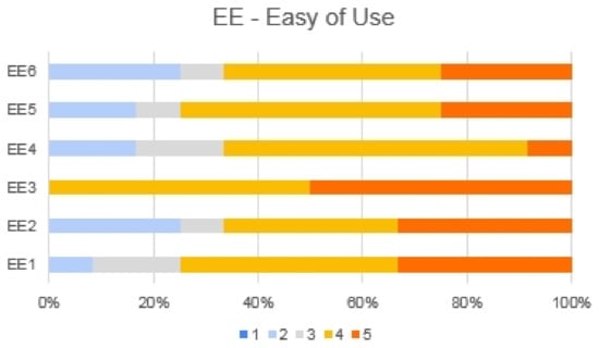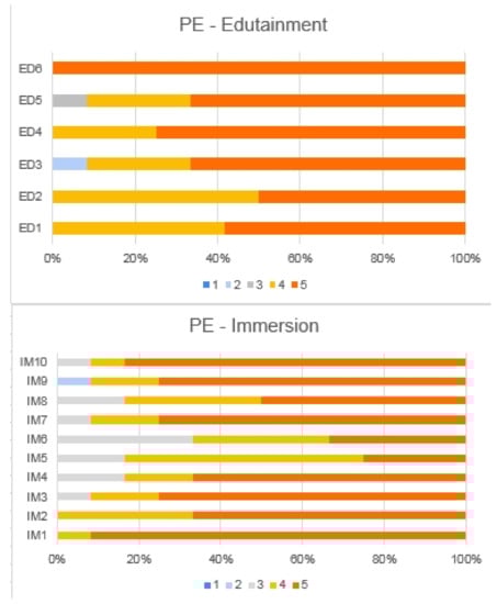 Our studies focused on examining the basic constructs: Performance Expectancy (PE) and Effort Expectancy (EE), adopted from the UTAUT model []. Evaluating Performance Expectancy of a digital storytelling applications is linked to measuring good experience and its important feature: immersion. In addition, evaluation of multimedia historical and cultural heritage applications involves measurement of another important factor combining education and entertainment: edutainment. The Effort Expectancy is linked to perceived ease of use, referring to the degree to which the user expects effortless use of a new technology.