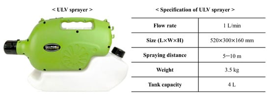 Spraying disinfectants that can kill or inactivate microorganisms is a widely used cleaning method as an alternative to physical cleaning [12,13]. The ultra-low volume (ULV) sprayer (Figure 1), which is mainly used to kill pests in agricultural fields, is nowadays being used to disinfect quarantine areas in order to eliminate influenza viruses and other infectious microorganisms from such spaces [13,14,15]. The advantage of a ULV sprayer is that it produces aerosols of a small particle size of 0.1 to 50 in the air, making it possible to reach spaces that are inaccessible to workers and reducing the spread of airborne infectious agents and dust particles in the air, by causing them to combine with the dispersed aerosol droplets and sinking them to the floor [15]. Most of all, this method is cost-effective because it can spray a small amount of disinfectant for a long time. A small disinfectant particle for single-use requires a much smaller amount than the disinfectant used for physical or chemical disinfection methods. In addition, the disinfectant used in the physical disinfection method cleans the surface once, while the disinfectant particles sprayed from the ULV spray disperse in the air for several minutes, continuously sticking to the surface to kill the microorganisms. However, there is a controversy over the disinfection efficiency of a ULV sprayer, because only a few studies have been conducted to verify the movement of the particles sprayed from a ULV sprayer indoors or confirm the mortality rate of microorganisms. Therefore, for efficient disinfection indoors, it is necessary to verify the disinfection efficiency of a ULV sprayer.