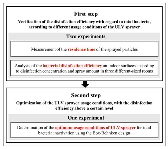 Two-stage experiments were performed to verify the efficiency of the ULV sprayer to eliminate total bacteria indoors by the different usage conditions (disinfectant concentration, spray amount, and room size), and to identify the optimum usage conditions for the ULV sprayer, which resulted in the highest disinfection efficiency in all spaces. Figure 2 shows the flow-chart of the experiments. The first step included two experiments, measuring the residence time of the sprayed aerosol and analyzing its disinfection efficiency with regard to total bacteria on indoor surfaces in three different-sized rooms. Based on the results of the first step, the second step was conducted using the response surface method, which is a widely used experimental design to optimize conditions for the inactivation of bacteria.