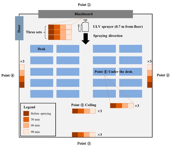 Figure 3 shows the ULV sprayer’s location in the classroom and the attached points of biofilm templates that were used to identify the disinfection efficiency. Biofilm templates were composed of three replicates. The ULV sprayer was set up on the center front desk in each classroom. The spraying angle was approximately 5 degrees upwards. Based on preliminary experiments, we selected six locations (① blackboard side wall, ② left wall (based on the spray direction), ③ the wall in the direction of the spray, ④ right wall (based on the spray direction), ⑤ ceiling, and ⑥ under the desk) to check the bacterial disinfection efficiency.