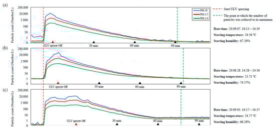 The residence time of dispersed aerosols following spraying using the ULV sprayer is presented in Figure 4. Residence time, the duration until the sprayed aerosol particle concentration decreased to less than 15 cm−3 without further reductions, was approximately 90 min when spraying 5 L over 230 m3 (Figure 4b). The highest number of PM10, PM2.5, and PM1.0 particles was 39,869, 5987, and 969, respectively, following spraying with the ULV sprayer. After 30 min, the number of particles was 543, 349, and 113, respectively, and after 60 min, it was reduced to 8, 8, and 7, respectively. Even if the spray amount was reduced or increased, the sprayed particles sank after 91 min and 76 min, respectively, resulting in a residence time similar to that for the 5 L spray amount of 91 min (Figure 4a,c).