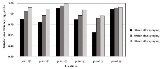 The disinfection efficiency for total bacteria on indoor surfaces is presented in Figure 5 by location and time after spraying. The disinfection efficiency was 0.56–2.46 log10 reductions at all sites and differed depending on location. The disinfection efficiency for point, ③ the wall in the direction of the spray, was highest at 1.35 log10, 1.61 log10, and 2.46 log10 at 30, 60, and 90 min, respectively. The lowest disinfection frequency was observed for point, ⑤ the ceiling, at 0.56 log10, 0.85 log10, and 0.93 log10 at 30, 60, and 90 min, respectively. Meanwhile, the disinfection efficiency for point, ① the wall behind the ULV sprayer, and point, ⑥ under the desk, was over 0.70 log10 and 1.00 log10, respectively, at 30, 60, and 90 min. Therefore, the ULV sprayer was effective for the disinfection of total bacteria on all indoor surfaces.