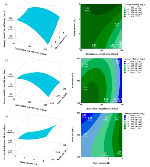 Response surface plots presenting the interaction effects of three variables on the average total bacteria disinfection efficiency: (a) surface plot showing the effect of disinfectant concentration and spray amount on the average disinfection efficiency, (b) surface plot showing the effect of disinfectant concentration and room size on the average disinfection efficiency, and (c) surface plot showing the effect of spray amount and room size on the average disinfection efficiency.