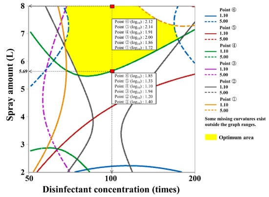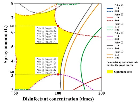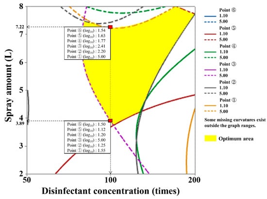 After studying the effects of the explanatory variables on the response variables, we optimized the six explanatory variables using the desirability function. We aimed to determine the optimum conditions that resulted in maximum bacteria disinfection efficiency in all areas. Moreover, workers cannot control the room size, as the disinfection space size is fixed. Therefore, we presented the optimum ranges for operating the ULV sprayer by room size to demonstrate conditions that can actually be controlled and used at the quarantine site. Figure 7, Figure 8 and Figure 9 depict the overlay plots of the effects of the disinfectant concentration and spray amount on the response variables at each room size. The yellowed area is the zone of the disinfection concentration and spray amount that demonstrated the optimal disinfection efficiencies at all locations. The different colors of curved plots show the disinfection efficiency in locations ①–⑥. We found the optimum usage conditions that predicted the total bacteria disinfection efficiency of >1.10 log10 reductions (92%) in all areas. As per the room size, the optimum conditions when using the recommended dilution factor of 100 were as follows: spray amount of 3.08–6.40 L in 160 m3, 3.78–7.22 L in 230 m3, and 5.68–8 L in 300 m3. Therefore, it can be concluded that the larger the room size, the higher the required spray amount for optimal disinfection efficiency when using the recommended disinfectant concentration.