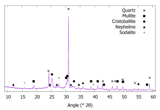 The X-ray diffractogram presented in Figure 1 shows a hump between 20 and 40° 2θ. This is characteristic for an aluminosilicate amorphous phase. The quantification by Rietveld refinement, using an external standard to determine the quantity of amorphous material, is given in Table 4. The high quantity of amorphous (56 wt%) appears promising for the applications, as usually the amorphous fraction of aluminosilicate SCMs such as coal fly ash is the most reactive phase of the material [30]. The major crystalline phases are quartz, mullite and cristobalite. The Na seems to be mostly present in the crystalline phases nepheline and sodalite. Nepheline can also contain minor amounts of potassium [31]. The remaining minor elements could not be associated with a specific phase at this point.