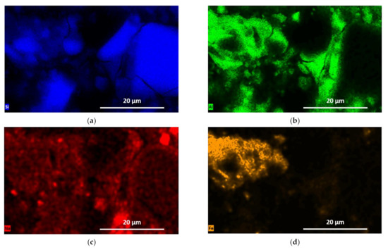 Elemental maps of the major elements in spent pot lining aluminosilicates obtained from energy dispersive X-ray spectroscopy measurements: (a) Si, (b) Al, (c) Na and (d) Fe. Note that these measurements were performed on image (b) in Figure 2.