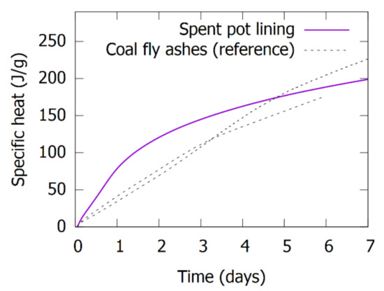 The reactivity of SPL as SCM was tested using the R3 heat release test at 40 °C. The specific heat presented in Figure 4 evolved towards 200 J/g after 7 days. This is similar to class F coal fly ashes, an SCM commercially used and added in Figure 4 as a reference. This implies that sufficient reactivity is present in the SPL aluminosilicates for use as SCM, provided no other non-cementitious exothermal reactions have occurred. Given the phase composition, the reactivity seems to stem from the aluminosilicate amorphous phase in the SPL.