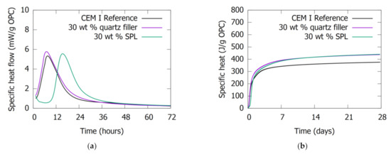 The interaction of the SPL aluminosilicates with the hydration of the cement was investigated by studying the reaction kinetics using isothermal calorimetry on cement pastes. The heat flow and heat are both shown in Figure 5, normalized to the amount of CEM I in the mixture. A mixture with 30 wt% of SPL aluminosilicates (70 wt% CEM I, water/binder = 0.4) was compared to two references: one pure CEM I (water/binder = 0.4) and one with 30 wt% quartz filler (70 wt% CEM I, water/binder = 0.4). The sample with quartz filler showed a slight acceleration of the hydration because of the filler effect. This effect also caused a higher cement reaction degree at late age, which can be seen by comparing the total heat at 7–28 days between the CEM I reference and the sample with 30 wt% of quartz filler. The SPL aluminosilicates caused a significant delay in the cement hydration reactions. This is observed most clearly in the heat flow curves, where a shift of the peak is observed. The height and shape of the peak was still quite similar to the references. The shift appeared mainly as a delay of the hydration reaction, when the reactions eventually start, they occur similarly as in the references. Eventually at late age (7–28 days) the cumulative heat was similar to the quartz filler. Whether there was a significant contribution from the reaction of SPL itself is not clear at 28 days, and would require independent measurement of the clinker degree of reaction in the composite cement.