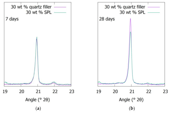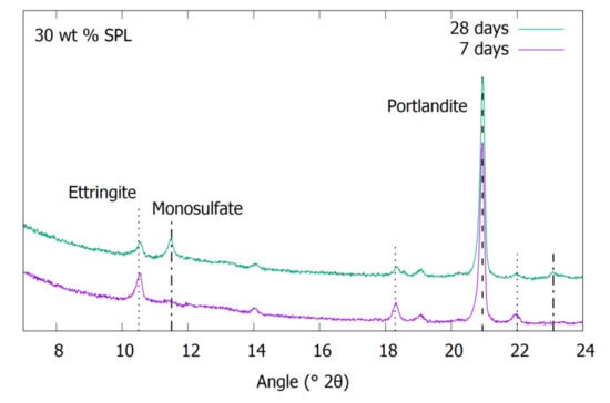 The hydration products from the reaction of the cement and SPL were characterized using XRD on samples that were hydration stopped after 7 and 28 days. The diffractograms in Figure 6 show the formation of ettringite and calcium monosulfoaluminate as hydration products. The formation of ettringite before 7 days and afterwards the formation of monosulfoaluminate corresponds to a regular behavior of Portland cement if there are no carbonates added to the mixture [33]. The content of sulfate in ettringite is higher and therefore, this phase formed until the systems ran out of sulfates, after which the formation of monosulfoaluminate started. No qualitative differences with the XRD results of the reference including 30 wt% of quartz filler were observed. The diffractograms of the references and the full diffractograms of the sample with 30 wt% SPL are available in the supplementary information in Figures S1 and S2. The amount of Ca(OH)2 (Portlandite) was investigated in more detail semiquantitatively. A comparison of the height of the peaks in Figure 7 shows that at 7 days a similar amount of Ca(OH)2 was present. At 28 days the amount of Ca(OH)2 in the sample with 30 wt% of SPL was significantly lower than in the sample with 30 wt% quartz filler, indicating the consumption Ca(OH)2. This suggests the pozzolanic reaction of the SPL. The significant Ca(OH)2 consumption was in line with the high heat release observed in the R3 test (Figure 4). The addition of SPL did not result in a change in the type of reaction products, nor was the amount of ettringite or monosulfoaluminate significantly impacted by the use of SPL as SCM, but the pozzolanic reaction of SPL was confirmed by the lower Ca(OH)2 content at 28 days.