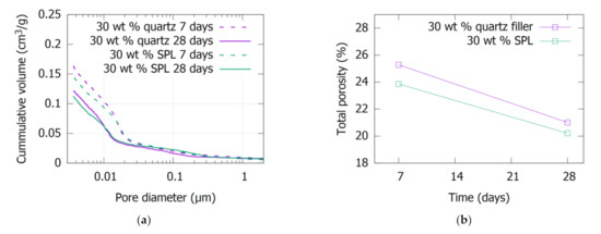 The porosity of the paste samples was studied on 7 and 28 days hydrated cements using MIP. The total porosity decreased by the introduction of 30 wt% SPL as opposed to a quartz filler (Figure 8). The pore volume distribution in Figure 8 shows that the increased porosity is most prominent in the gel porosity below 0.01 µm (10 nm) [34]. The pore filling effect, which is commonly associated to highly reactive SCMs like metakaolin, should be observed as a shift in the threshold pore size—the pore size below which the porosity increases steeply [35]. This effect is observed when comparing 7 and 28 days results, but this is not seen when comparing the pore size distribution of the samples with 30 wt% of SPL and 30 wt% of quartz filler. The reactivity of SPL appears not sufficient to have a significant pore refinement effect on the cement microstructure.