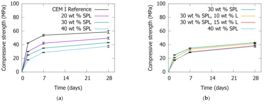 Compressive strength evolution of mortars using several replacement levels of spent pot lining aluminosilicates (SPL) as supplementary cementitious material (a). The influence of the addition of limestone (L) to mixtures with 30 wt% of SPL is shown in (b).