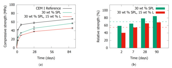 Compressive strength evolution of mortars with 30 wt% spent pot lining aluminosilicates (SPL) as supplementary cementitious material, including 90 days strength (a). The relative strength is calculated and compared to the replacement level (b). The replacement level is represented by a dotted line as a visual aid (in green for 30 wt% replacement—70% strength and in red for 30 + 15 wt% replacement—55% strength).