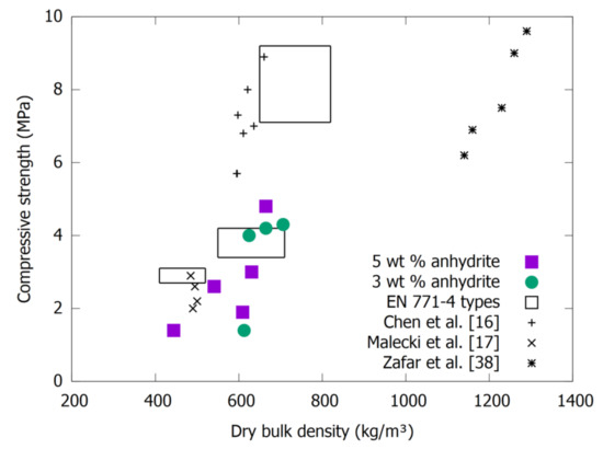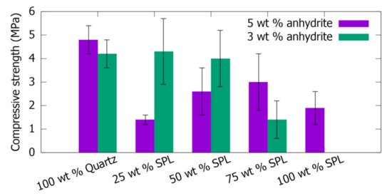 The compressive strength of the blocks is presented in Figure 12. The strength-density relation is plotted on Figure 13. The strength of the reference mixture (100 wt% quartz, 5 wt% anhydrite) reached approximately 5 MPa, which is a decent strength considering the density [18,19,20,41] and reaches the required strength (4 MPa) for a block of medium density (600–660 kg/m3) according to EN771-4 [40]. The strengths and densities are more easily compared with literature and standard values in Figure 13. This strength was not decreased significantly when using only 3 wt% of anhydrite, which would decrease the sulfate leaching when recycling the block at the end-of-life of the building [28]. The effect of the substitution of the quartz for SPL aluminosilicates is most easily seen for the 3 wt% anhydrite samples, as a similar density was obtained for these samples (Figure 11). The strength did not decrease significantly up to 50 wt% of substitution. The compressive strength still reached 4 MPa for a density of 600 kg/m3. The use of 75 wt% of quartz-SPL substitution resulted in a significant decrease in strength when using 3 wt% of anhydrite. At 5 wt% of anhydrite the compressive strength for the 75 wt% substitution samples was slightly improved, however, also for these samples the strength density relation is not satisfactory and did not reach the values of a commercial AAC strength class according to the EN standard (see Figure 13).