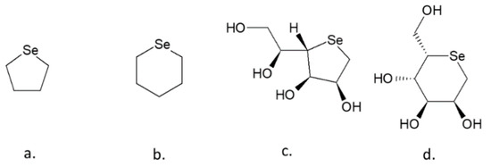 Structures of the trahydroselenophene (a), selenane (b), and some derivates: 1,4-anhydro-4-seleno-hexofuranose (1,4-anhydro-4-seleno-D-talitol) (c) and 1,5-anhydro-5-seleno-hexopyranose (1,5-anhydro-5-seleno-D-mannitol) (d).