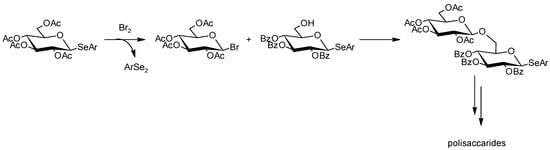 The Se-glycosidic bond is resistant to enzymatic hydrolysis; therefore, selenoglycosides can act as inhibitors of glycosidase enzymes [237,238]. This type of sugars found application in disaccharide and oligosaccharide synthesis as glycosyl donors, where an arylselenyl group introduced at the anomeric position functions during glycosylation as a leaving group (Figure 3).