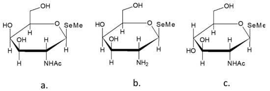 Most of selenoglycosides are obtained by chemical synthesis. However, three natural selenoglycosides, identified as derivatives of galactosamine and glucosamine, have been detected in human urine [167,168,169]. Kobayashi et al. (2002) stated that selenium was excreted into mammals’ urine in the form of these selenosugars, when selenium intake was lower than the toxic level [168] (Figure 5).