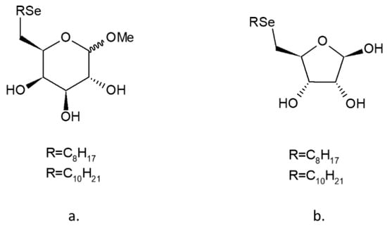 Se-alkyl- and Se-arylselenides derived from carbohydrates contain an organoselenium moiety at the non-anomeric position of sugars [200,240,241] (Figure 7). Many of these synthetically obtained sugar derivatives show biological activity, e.g., antioxidant activity. Further, Vargas et. al. (2015) reported synthesis of simple alkylseleno-carbohydrates with different sugar scaffolds. Screening of the selected compounds for antioxidant activity revealed that several of them express free radical scavenging activity and therefore can potentially prevent oxidative damage of proteins and lipids [242].