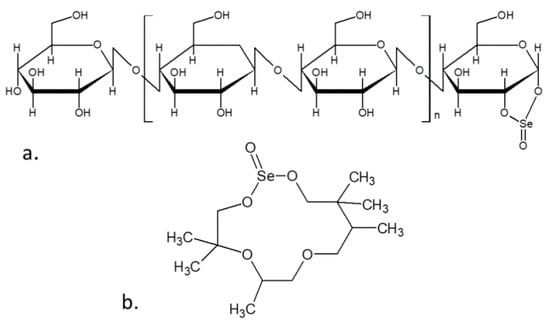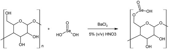 Carbohydrates, as polyhydroxy aldehydes or ketones, contain several hydroxyl groups that may react with an appropriate acidic compound, resulting in the formation of sugar esters. Among them are the selenious acid esters. The selenylation (esterification/acylation with selenious acid) reaction may be conducted, for example, using the HNO3–Na2SeO3 method [243] (Figure 8).