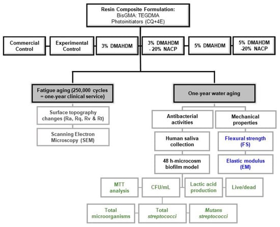 Flowchart of the experimental design proposed in this study. Different antibacterial formulations were designed. Following the aging, the mechanical properties were assessed via flexural strength, elastic modulus, and measurements of the topography changes following simulated wear. The antibacterial activity was analyzed by biofilm plate counting method, metabolic assay, colorimetric quantification of lactic acid, and Baclight ® bacterial viability assay.