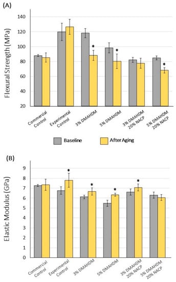 In Figure 2A, the 3% DMAHDM, 5% DMAHDM, and 5% DMAHDM-20% NACP groups had experienced a significant reduction in the flexural strength following the water aging (p < 0.05). Although values are acceptable according to ISO 4049 []. For the elastic modulus (Figure 2B), experimental control, 3% DMAHDM, 5% DMAHDM, and 3% DMAHDM-20% NACP were increased after aging by around 8% (p > 0.05; power of analysis = 100%).